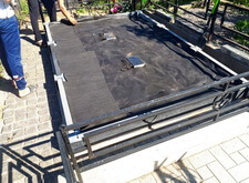 Укрываем внутреннюю зону участка геотекстилем и приносим три массивные прямоугольные плиты, которые в дальнейшем послужат наземным покрытием могилы.